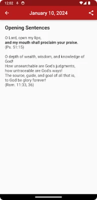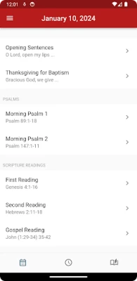 The app provides liturgies for Morning, Midday, Evening, and Night Prayer, selecting the appropriate service and lectionary readings based on the time and date settings of your iPhone or iPad. The calendar tool allows users to find psalms, readings, and prayers for other dates. Use the clock icon to select Morning, Midday, Evening, or Night Prayer, overriding current time of day.