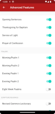 The “advanced features” menu allows users to toggle on/off various options in the liturgy for Daily Prayer and select between two versions of the Lord’s Prayer.
