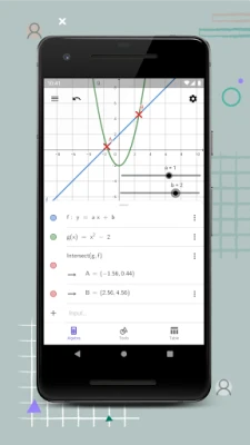 • Plot functions, polar and parametric curves • Experience transformations with sliders • Get special points of functions: roots, min, max, intersections • Do regression with best-fit lines • Search for free learning activities directly from our app • Save and share your results with friends and teachers